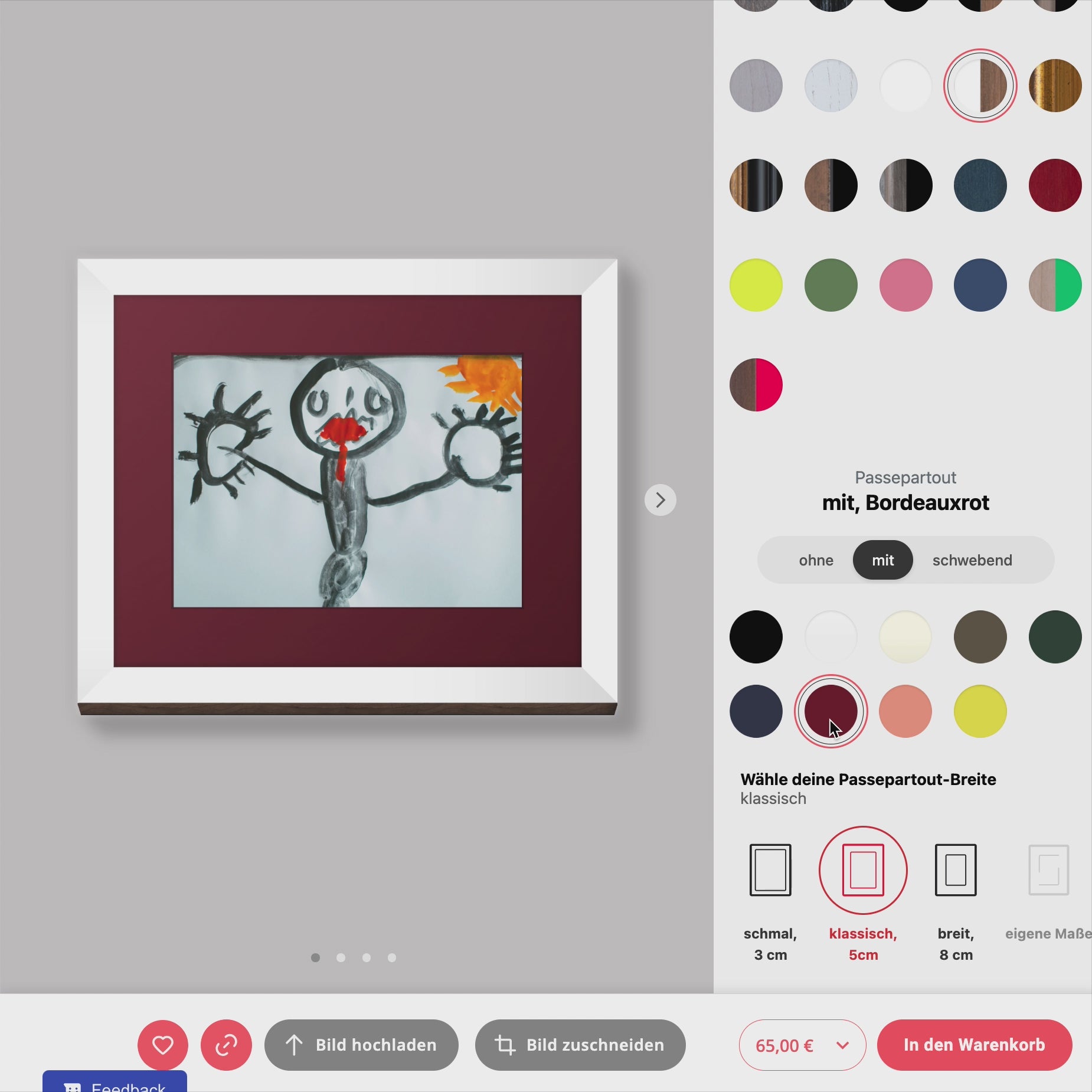 Du kannst Deinen Kinderbilderrahmen ganz einfach selbst gestalten: Wähle Größe, Material und Rahmenfarbe, die am besten zu den Zeichnungen oder Gemälden Deines Kindes passen. Ob einzelne Werke oder eine kleine Galerie – mit einem maßgefertigten Rahmen bringst Du Kinderkunst auf liebevolle Weise zur Geltung.