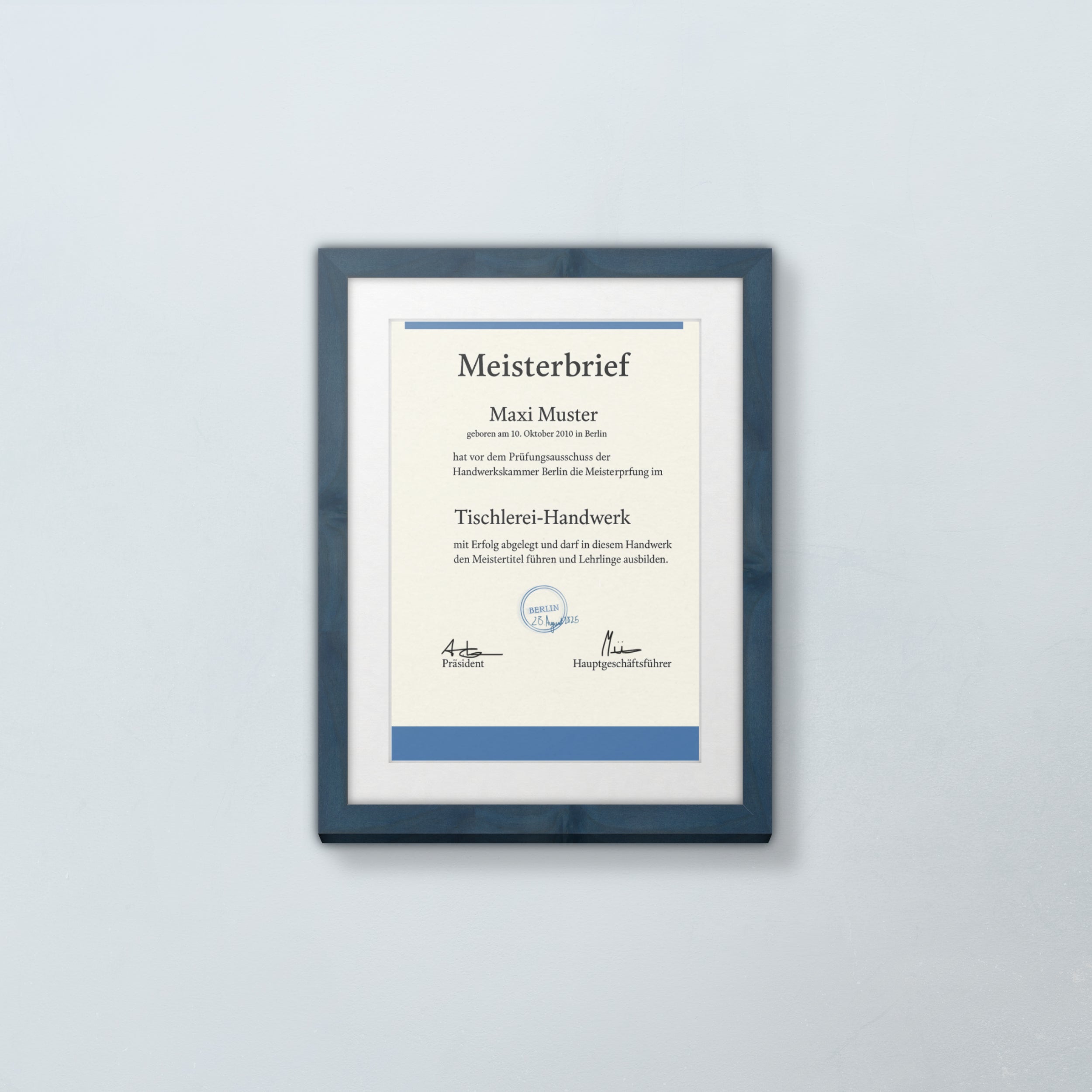 Customize your certificate frame or choose a ready-made model. Our favorite: hand-lacquered wood in sapphire blue with a classic Oxford-blue mat. Which frame showcases your achievement best?